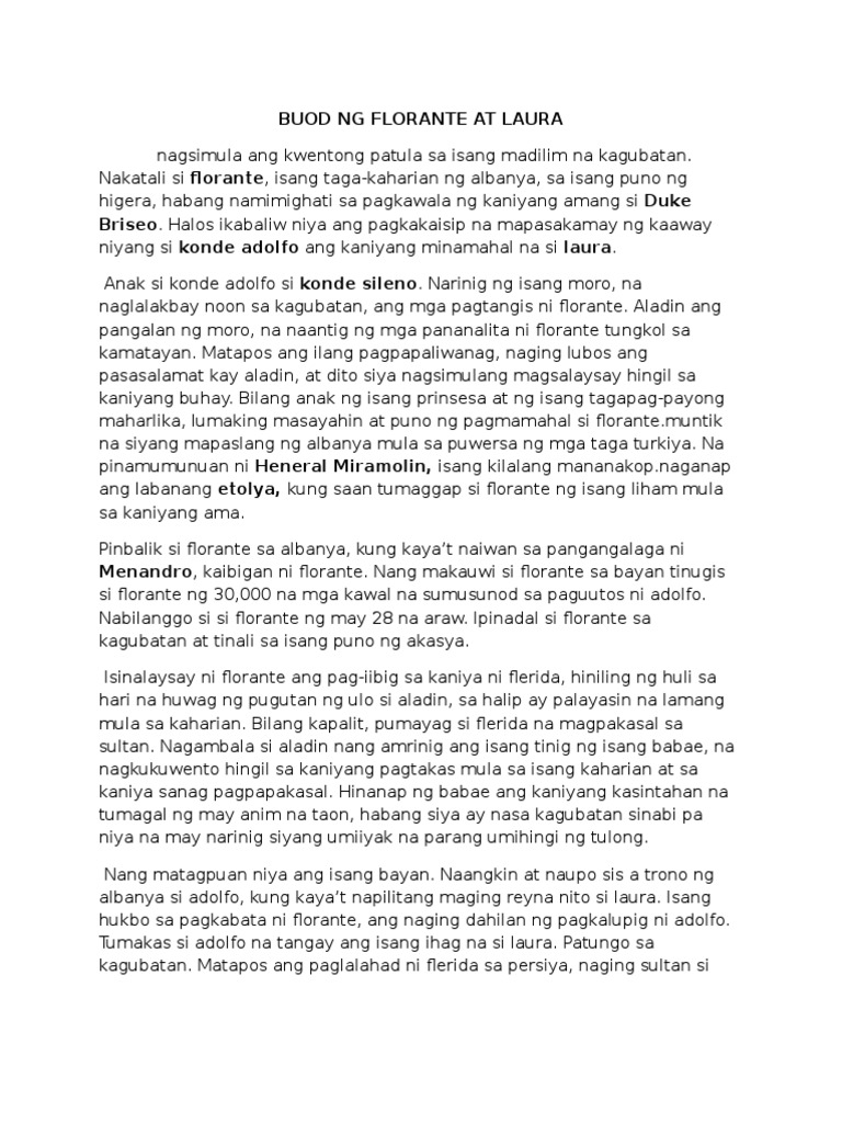 Buod ng Florante At Laura. Share Florante at Laura. Buod ng Florante at Laura Ang kuwento ng Florante at Laura ay nagsisimula sa isang madilim na gubat sa may dakong labas ng bayang Albanya malapit sa ilog Kositong na ang tubig ay makamandag.