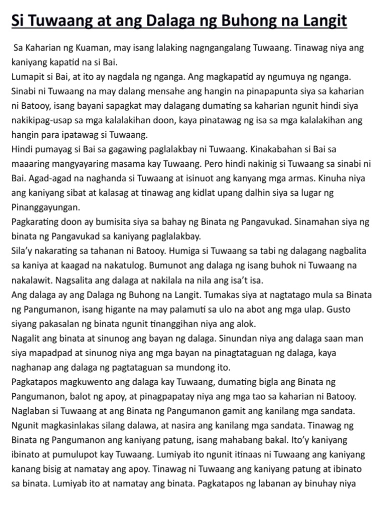 Buod tuwaan at buhong na langit. ---Subalit may mga nakatatanda na walang pinagkatandaan o tumanda ng paurongso to speakMay mga DOM o Dirty Old Man na sa halip na maging magandang halimbawa at magturo at umakay sa mga kabataan sa kabutihan sa halip ay sila pa ang pasimuno sa kasalanan at. Binantaan man ng kaniyang tiyahin ay hindi nakita si Tuwaang. Ito ay tutulong sa iyo upang mauunawaan mo kung bakit napabilang ang epiko sa matatandang uri ng panitikan na nananatili pa rin sa kasalukuyan.